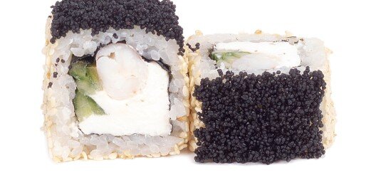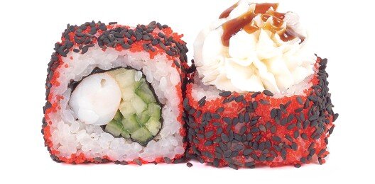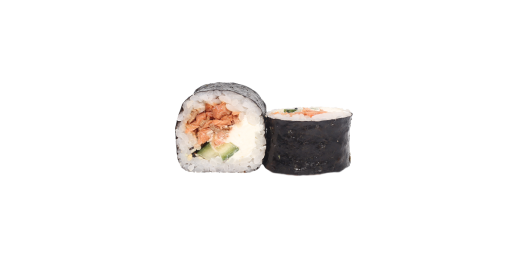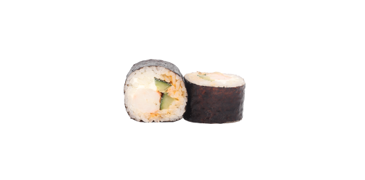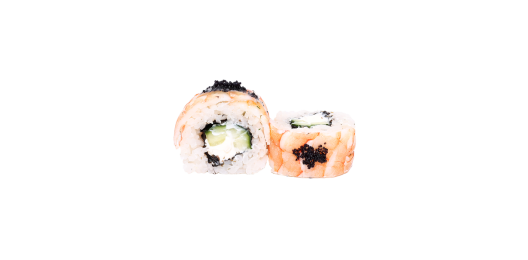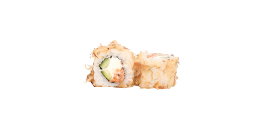 Рис, нори, сыр сливочный, креветка темпура, огурец.