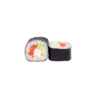 Рис, нори, сыр сливочный, жареный лосось терияки, огурец, кунжут белый, кунжут черный.