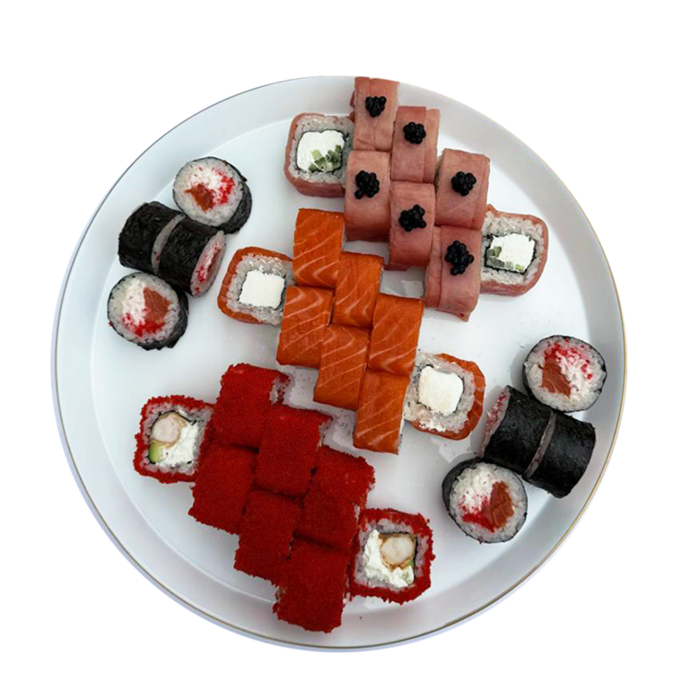 Ролл Филадельфия ,Ролл Калифорния с креветкой темпура, Ролл с лососем и крабом, Роллл Филадельфия с тунцрм