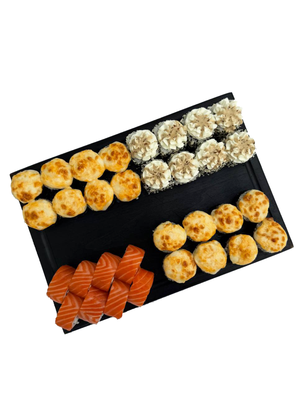 Ролл Филадельфия, Ролл Нежный краб, Ролл запечённый в кунжуте, Ролл запеченный курица с ананасом.